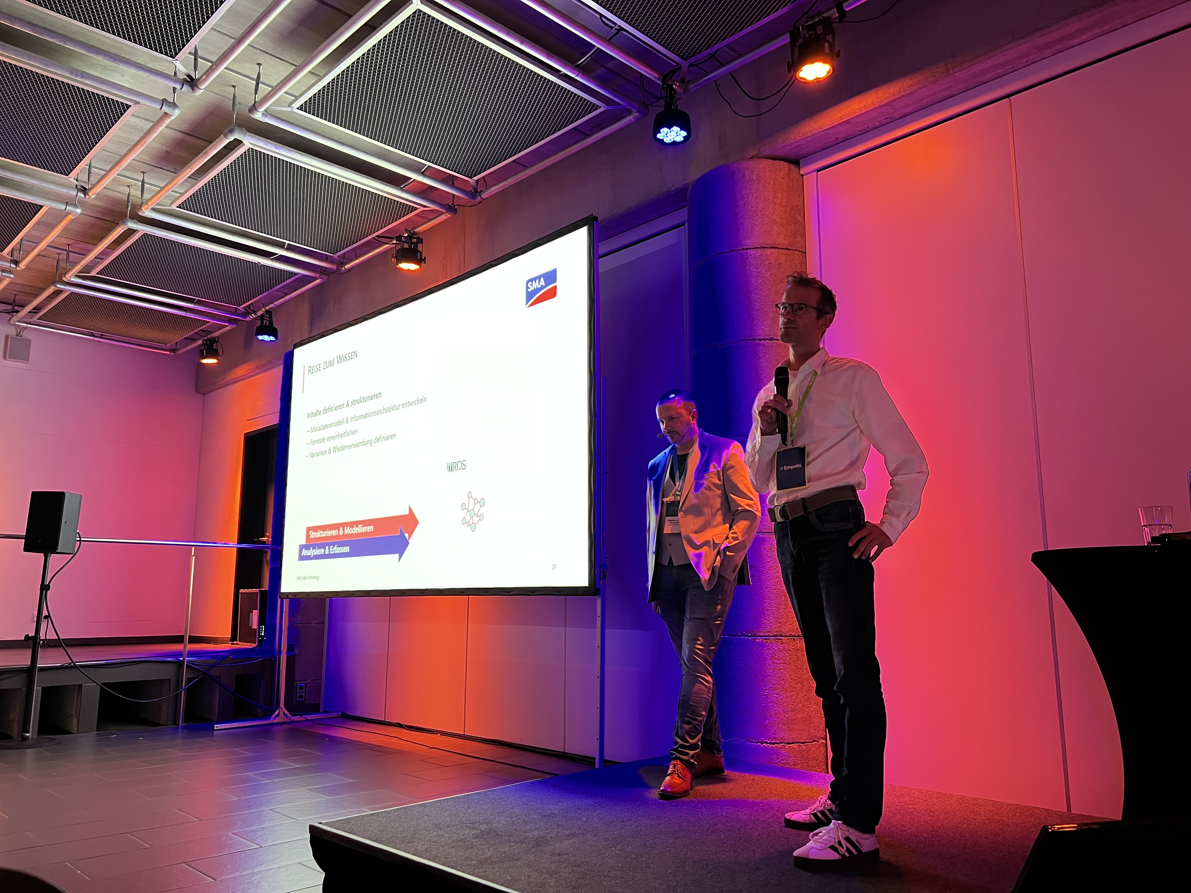 Unter dem Titel „Wertschöpfungskette Wissen: Produkt- und Service-Know-how vernetzen“ präsentierten Stephan Steuer von ICMS und Johann-Jörgen Schübeler von SMA Solar Technology, wie Unternehmen Wissen systematisch miteinander verbinden können.